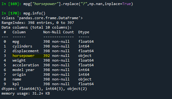 mpg["horsepower"].replace("?",np.nan,inplace=True)