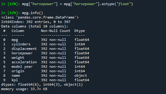 mpg["horsepower"] = mpg["horsepower"].astype("float")