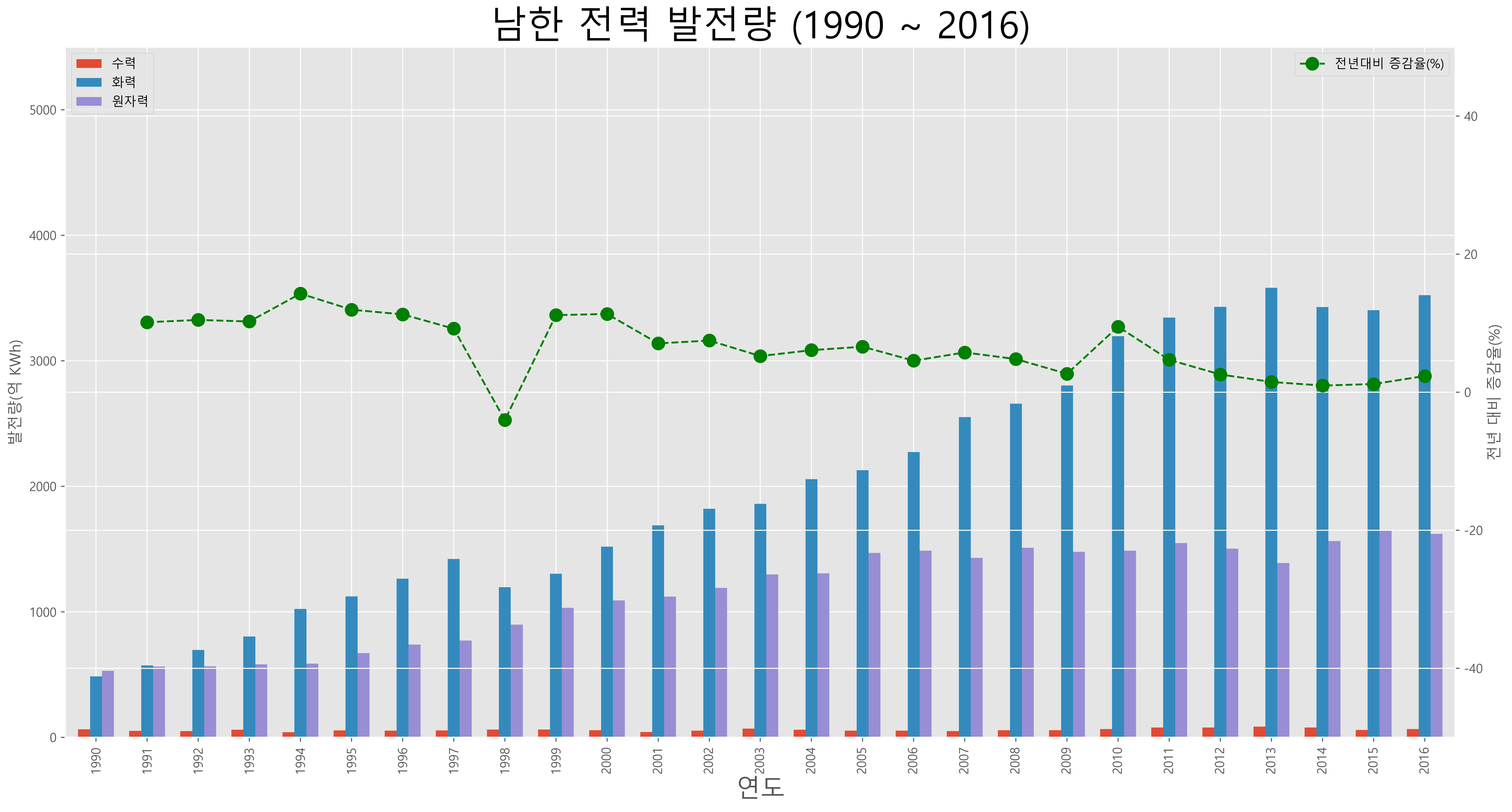 ax1.set_ylabel('발전량(억 kwh)') # 막대그래프 y축 값의 설명