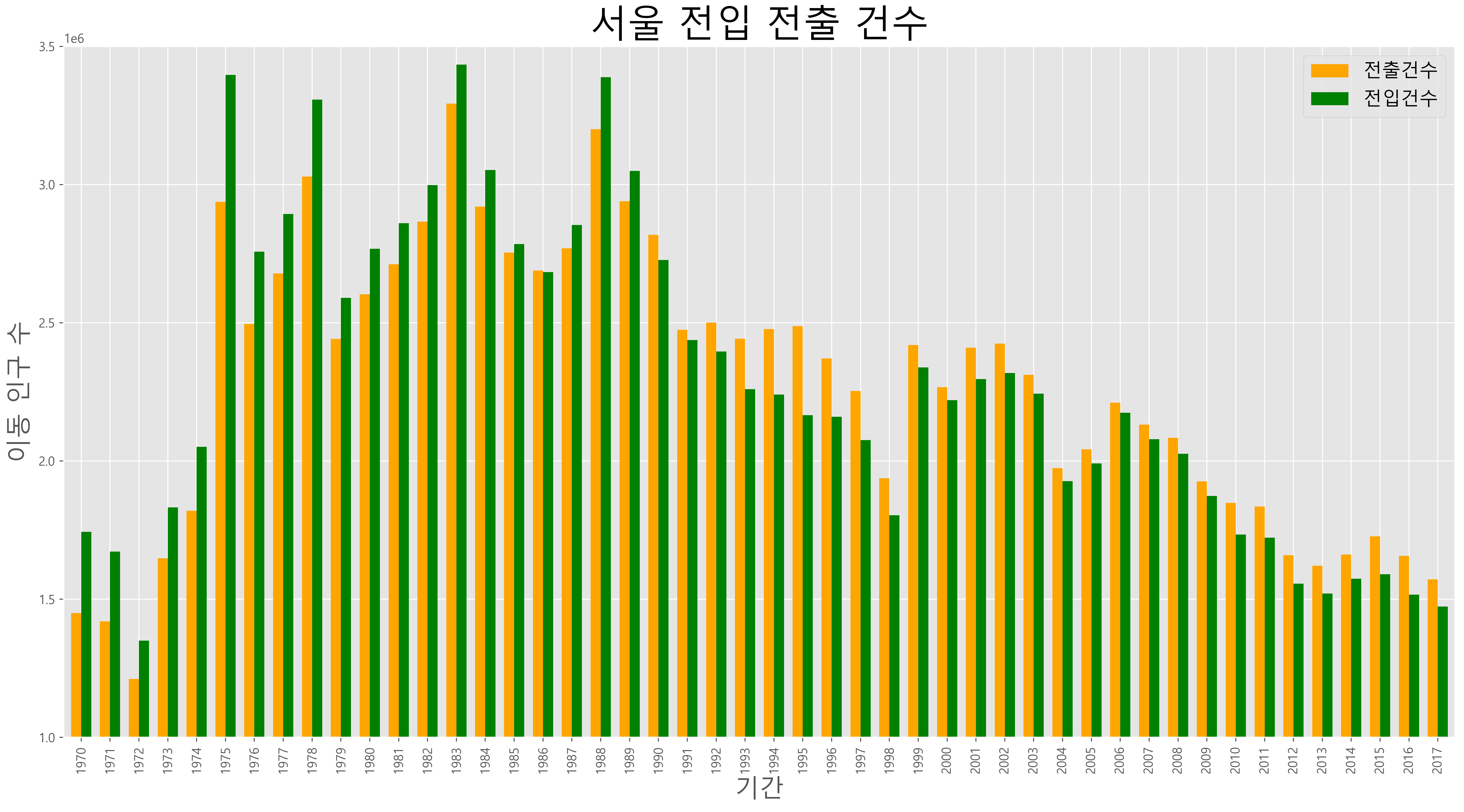#1. 년도별 서울의 전입과 전출 정보를 막대그래프로 작성하여
